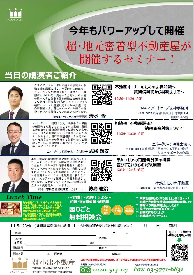 多様な法分野に精通する弁護士集団の「MASSパートナーズ法律事務所」から清水修氏、そして税務会計と財務の適切な処理と対策の実行に定評のある「エバーグリーン税理士法人」から成松啓安氏を招き、「相続」に対する具体的な事例を基に分かりやすく講演頂く予定です。